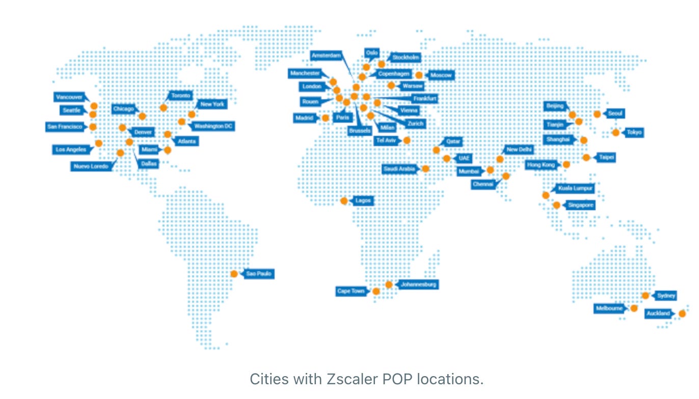 Zscaler זה קיצור של "zenith of scalability". הם מספקים ענן אבטחה ענק שמבוסס על edge, מקיף את כל הגלובוס, ומבוזר על פני 150 נקודות גישה (Point of Presence) כדי להיות קרובים ככל האפשר למיקום של המשתמשים, האפליקציות, והרשתות.