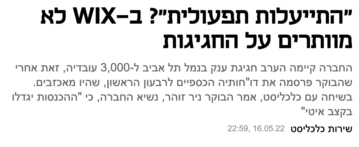 אמנם התפרסמה אתמול ידיעה על פיטורים בוויקס, אבל מדובר בפחות מ-2% מכח האדם (בהשוואה למשל לצמצום של 10% ב-Shopify). ולא שמענו מההנהלה תכניות על הפחתת השקעות או שינוי בתחזיות. להיפך.