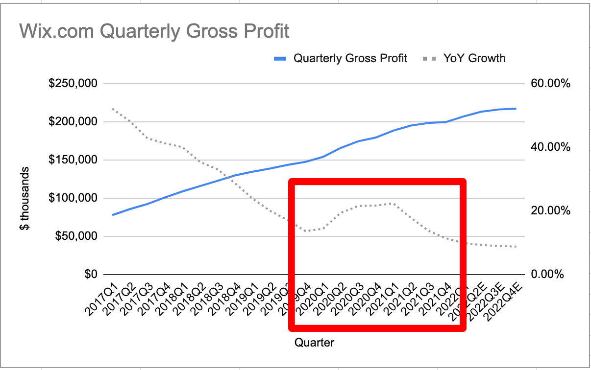 כמו מנצחות הקוביד מהפוסט הקודם, גם ההכנסות של וויקס הואצו מאוד בזמן המגיפה, וחווות האטה משמעותית ב-2022. הקו הכחול מייצג את הרווח הגולמי הרבעוני מאז 2017, הקו המקווקו מייצג את קצב הצמיחה (ההולך ודועך בהדרגה), והריבוע האדום מצביע על תקופת המגיפה: