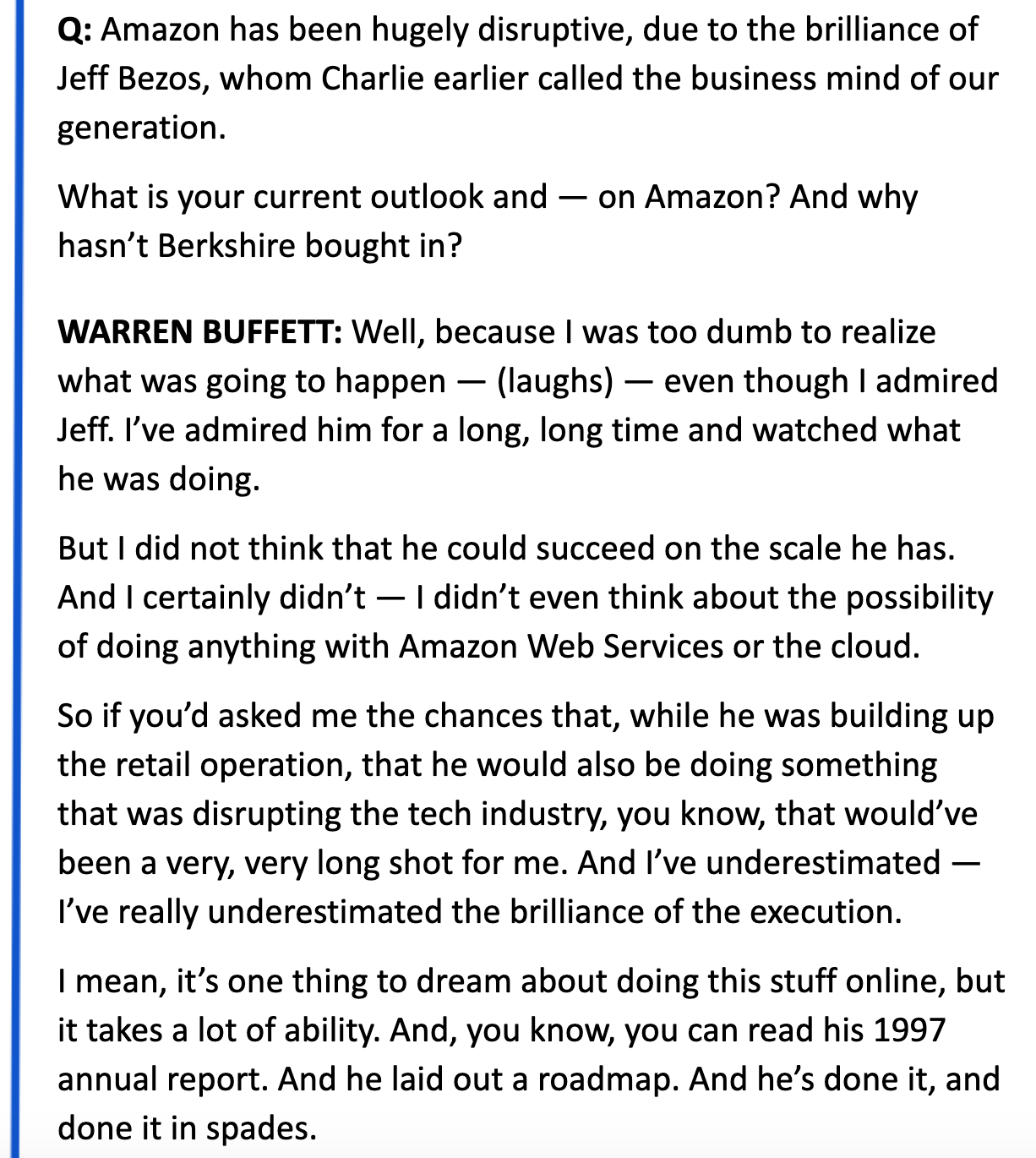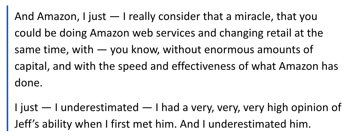 עוד לקח מעניין הוא שבאמת קשה לחזות את הדינמיקות האלה, וקשה מאד לזהות אותן אפילו כשהן כבר מתרחשות. זה היה ב blind spot של באפט שהגדיל את ההשקעה שלו ב-IBM בין 2011-2015, וב-2016 עוד דיבר עליה באופטימיות, עשר שנים אחרי ההשקה של AWS. ב-2018 הוא הירבה להלל את אמזון וג׳ף בזוס, אבל תיאר את ההצלחה של שירותי הענן בתור נס או פלא, שבדיעבד אפשר להבין איך הצליח אבל הוא לא היה מהמר עליו.