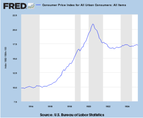 הבנק הפדרלי שרק הוקם כמה שנים קודם לכן ב-1913 נמנע מלבצע פעולות דרמטיות. שיעורי הריבית היו נמוכים במהלך המלחמה כדי להקל על המימון שלה. המדיניות המוניטרית נשארה מתירנית גם לאחר הפסקת האש, כדי למנוע הפסדים ממחזיקי אג״ח המלחמה, להפחית את עלויות החוב הממשלתי הגבוה, ולאפשר מעבר חלק יותר מכלכלת מלחמה לכלכלת שלום. כתוצאה מכך האינפלציה המשיכה לנסוק גם לאחר תום המלחמה, לדאגתם הרבה של קובעי המדיניות.