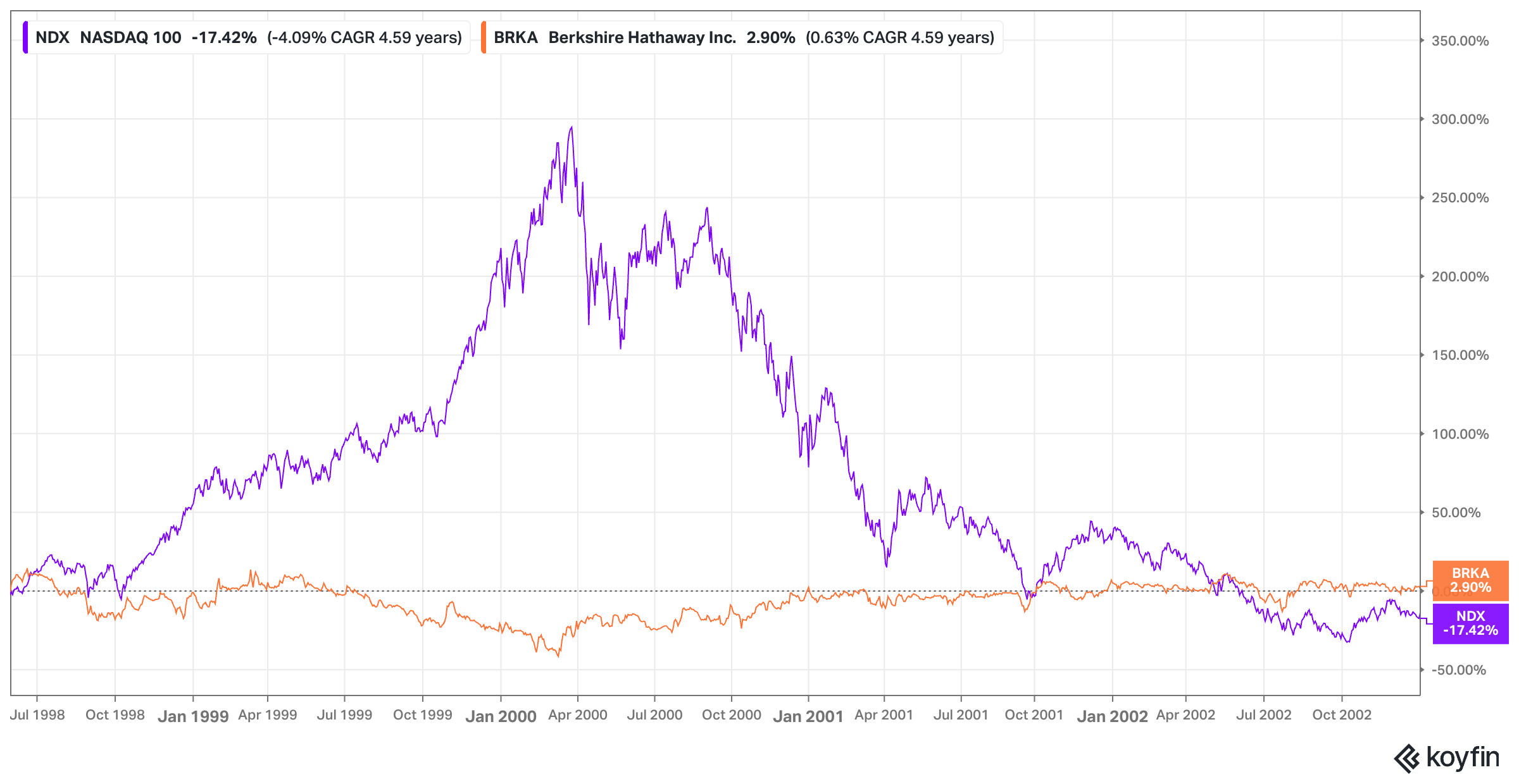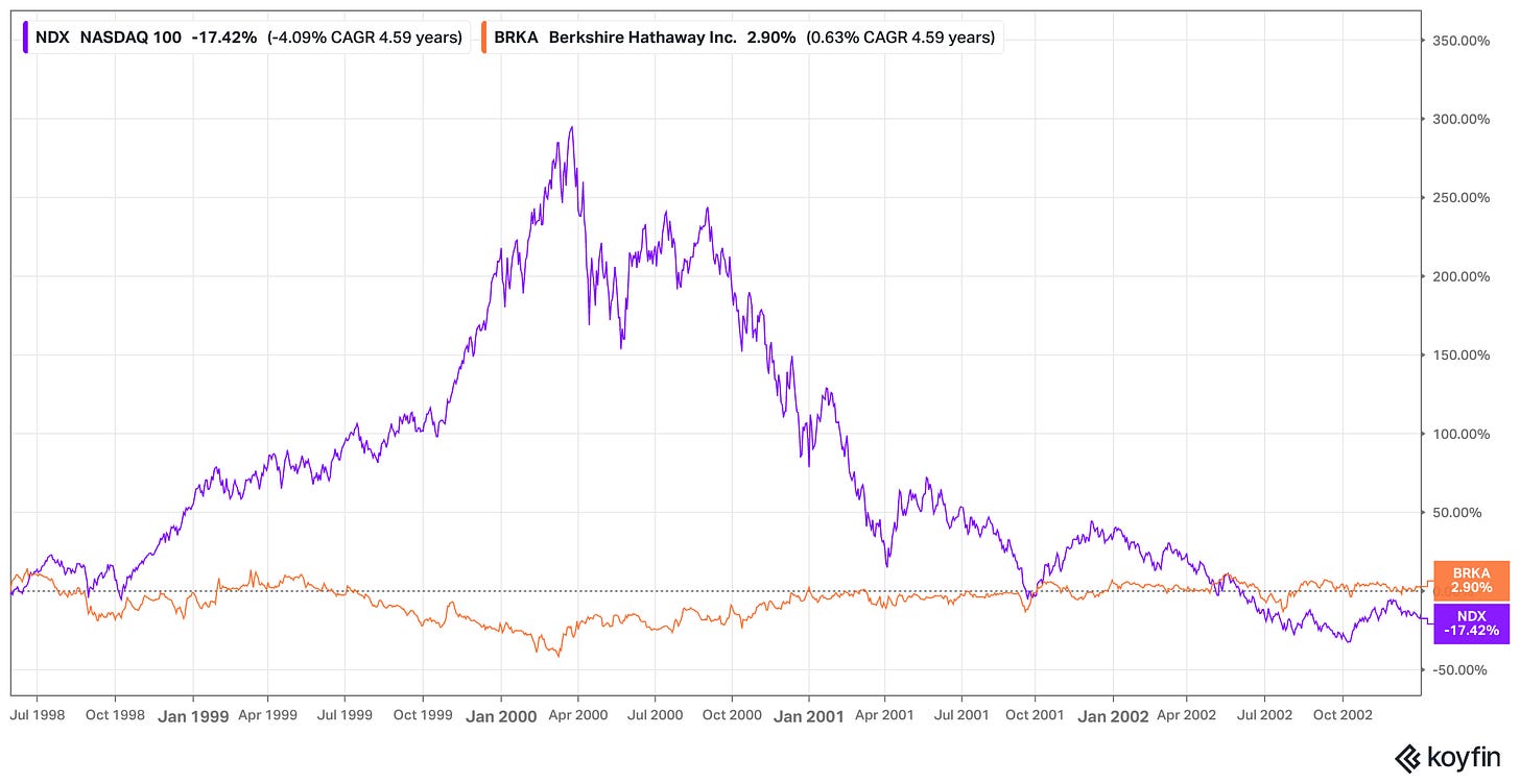 הביקורת על באפט, שהוא זקן מדי כדי להבין את הכלכלה החדשה של האינטרנט, הגיעה לשיאה, יחד עם מדד הנאסד״ק, במהלך שנת 1999; רק בתחילת שנות ה-2000 התברר שהוא דווקא צדק. מי שקנה מניה של ברקשייר האת׳אוויי באותו יום שבו באפט הסביר על הבמה באוניברסיטת וושינגטון שהוא נמנע ממניות אינטרנט, עשה תשואה של 2.9% עד תחילת 2003. התשואה הזו הייתה גבוהה יותר אם באפט לא היה עושה את הטעות של להמשיך להחזיק את קוקה-קולה, מניה שגם הגיעה למחיר מופרך באופוריה של 1999 (מהדורה 91). אבל, לפחות התשואה של ברקשייר הייתה חיובית; מדד הנאסד״ק, שזינק פי 4 עד לשיא של תחילת שנת 2000, היה עדיין בתשואה שלילית של 17.42%-, ביחס לקיץ 1998, באותה נקודת זמן בתחילת 2003.