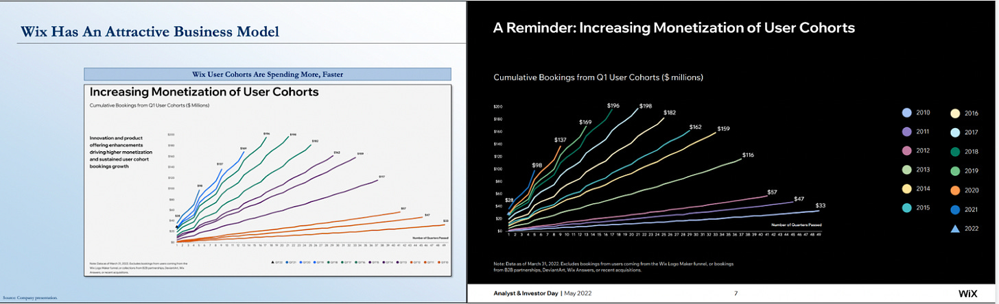 במצגת של סטארבורד מופיע בדיוק אותו גרף שמופיע בשקף השביעי במצגת של ניר זוהר - במסגרת תיאור של חלק אחד (יוצרים בשירות עצמי) מתוך שני העסקים שלטענתו מרכיבים את וויקס - תחת הכותרת ״לוויקס יש מודל עסקי אטרקטיבי״. גם הנתונים שסטארבורד הזכירה לגבי וויקס - 110%+ Net Retention - הם נתונים של עסק השירות העצמי. האופן שבו אני מבין את זה הוא: מבחינתנו וויקס הוא מעתה הפעילות שמוכוונת ליוצרים בשירות עצמי. סטארבורד מתעלמת לגמרי מהחלק השני של העסק.