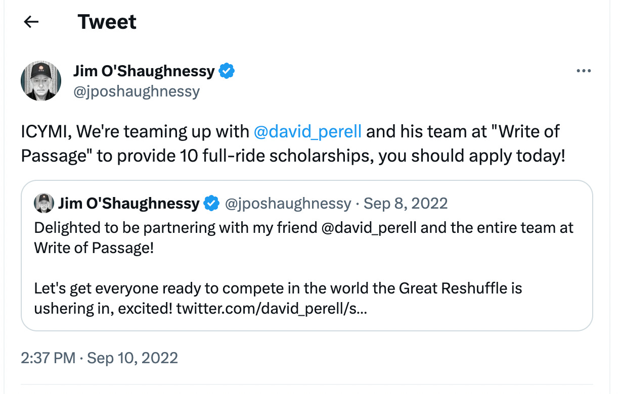 זה דיוויד פרל, שסרטון קצר שלו שמפציר בכם להיכנע לאני האמיתי שלכם, הוזכר במהדורה 39. הוא מתארח כאן בפודקאסט של ג׳ים אושאנסי, שהכתרתי במהדורה 37 בתור ״גיבור אמריקאי״. הוא מספר שם על קורס הכתיבה באינטרנט שהוא מנהל, Write of Passage. הוא בנה בעצמו קריירה שהתחילה מכתיבה בטוויטר ובבלוג שלו, והחליט לבנות קורס שיעזור לעוד אנשים לעשות את זה. וג׳ים אושאנסי כל כך התלהב מהקורס הזה, שבמחזור האחרון הוא החליט לשלם על 10 מילגות לאנשים שייקחו אותו. דייויד פרל התארח בפודקאסט של ג׳ים, Infinite Loops, לשיחה מרתקת על קריירה בעידן האינטרנט, על כתיבה, על סקרנות, על הבעיות העמוקות עם מערכת החינוך המסורתית, ועל איך למצוא ולפתח את תחומי העניין שטבועים בך.