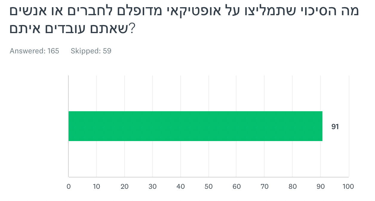 בשורה התחתונה, יש בממוצע 91% סיכוי ש-165 הקוראים שענו על השאלה ימליצו על אופטיקאי מדופלם. מצד שני, אלו כנראה 165 הקוראים הנלהבים ביותר, שטרחו למלא את הסקר וגם להגיע לשאלה האחרונה. אני תמיד מעריך את זה כשקוראים ממליצים על הבלוג, זו הדרך העיקרית שבה אני מגיע לקוראים וקוראות חדשים, וזה בעיקר מה שנותן לי מוטיבציה להמשיך לעבוד על זה.