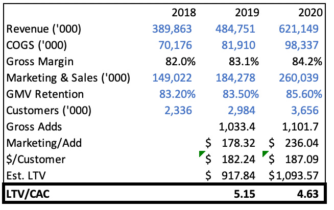 זה מעניין לבחון את ה unit economics ברמה של הלקוח הממוצע, בגלל שההצדקה לכך שחברות כאלה הן הפסדיות תמיד הייתה שהן רווחיות על בסיס הלקוחות הקיימים שלהן, אבל משקיעות הרבה ברכישת לקוחות חדשים. ובגלל שחוקי החשבונאות המסורתיים נוצרו בתקופה התעשייתית, הם מאפשרים להכיר בפחת על השקעה בבניית מפעל חדש או הנחת מסילת רכבת חדשה במשך כמה שנים, אבל הוצאות שיווק כדי ״לרכוש״ לקוח חדש נחשבות להוצאה שוטפת ולא להשקעה. עם ההסתייגות שמספר ממוצע שנתיים מאבד הרבה ניואנסים, ו״אפשר לטבוע כשחוצים נהר עם עומק ממוצע של 60 ס״מ״, אפשר עדיין לראות טרנדים ולבחון את הבריאות של העסק דרך זה.