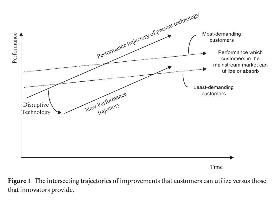 וזה הגרף שהסביר את התיאוריה של כריסטנסן במאמר המקורי, Disruption, disintegration and the dissipation of differentiability, שפרסם ב-2002. היא התבססה על אינספור ראיות משווקי המחשבים, השירותים הפיננסיים, המעבדים והכוננים הקשיחים. בכל המקרים האלה, מוצר אינטגרטיבי ניצח מוצר מודולרי בשלבים המוקדמים של שוק חדש, עד שהגישה המודולרית הייתה ״טובה מספיק״, ואז המחיר הזול יותר שלה, הודות להתמחות והתייעלות בייצור של כל תת-רכיב, הוא זה שניצח.
