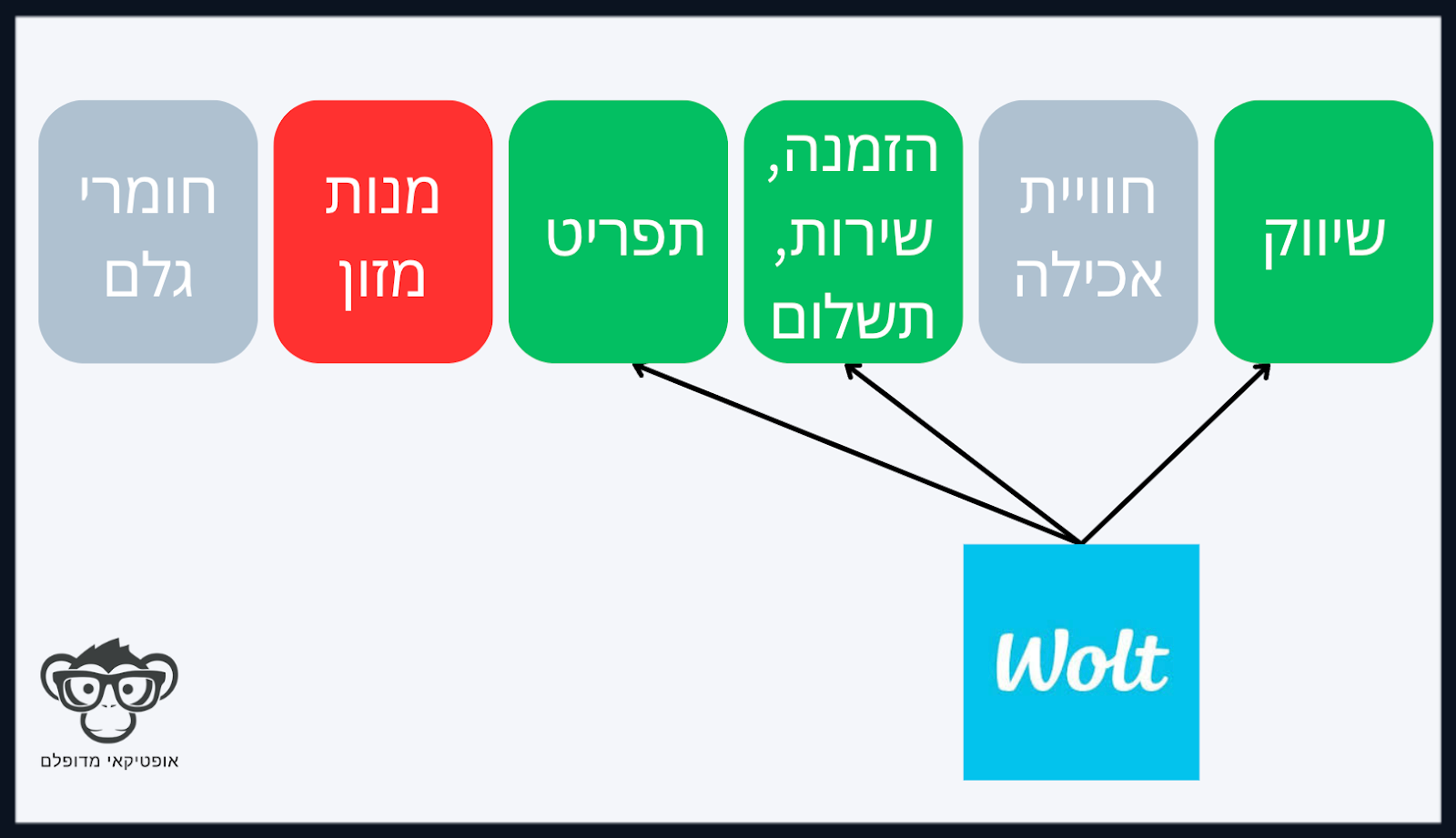 וולט, באמצעות חוויית משתמש חלקה, ובניית צי יעיל של שליחים, תפסה אחיזה במרכז שרשרת הערך הזו. לפחות בכל מה שנוגע למשלוחים (או איסוף עצמי). הנוחות, והמחיר הזול (בשלב הראשוני) אפשרו ליותר ויותר צרכנים לשכור את וולט כדי לענות על עוד ועוד משימות עבורם, מארוחת ערב אחרי יום עבודה, דרך מצרכים שוטפים ועד מאנץ׳ לילי או צהריים לילדים במהלך פיקניק בפארק.