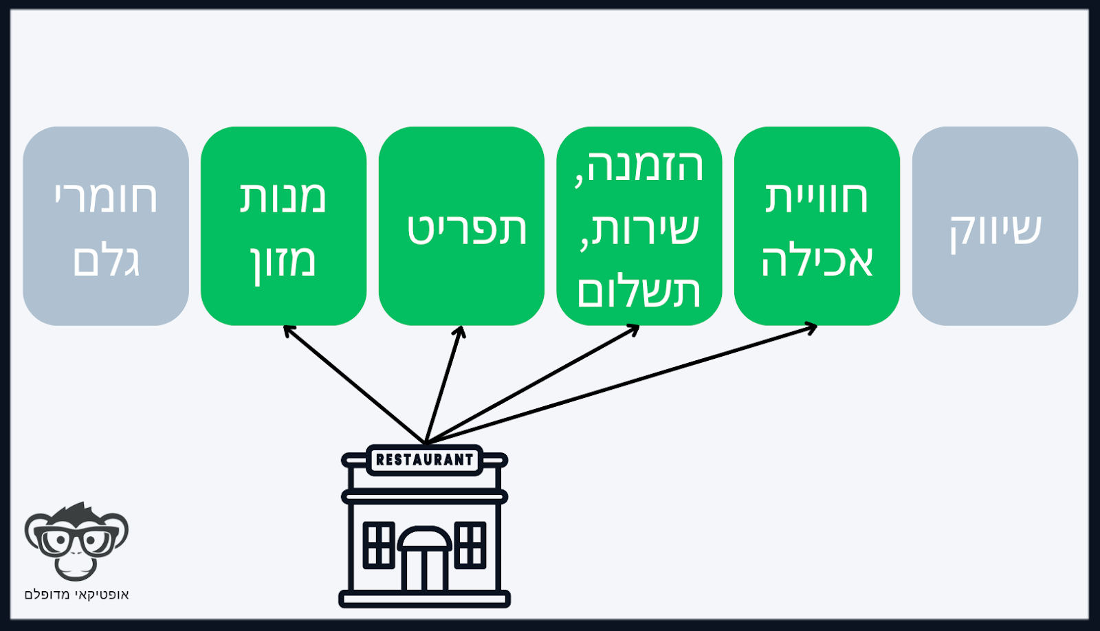 - הזמנה, שירות, תשלום: מלצרים, שלוקחים הזמנות, מביאים את המנות, מוודאים שהסועדים מרוצים, ומחייבים אותם על הארוחה