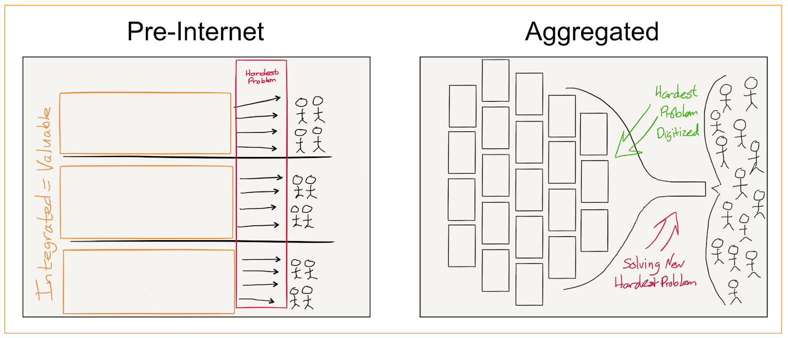 דיברנו פה בעבר על תיאוריית האגרגציה של בן תומפסון, ועל חוק שימור הרווח האטרקטיבי של כריסטנסן (וגם בפרקים 13 ו-14 של אופטיקאסט). התיאוריה הזו של כריסטנסן אמנם לא זכתה לפופולריות דומה לתיאוריית הדיסראפשן, אבל בעיניי היא לא פחות חשובה: היא עוזרת להבין לאן זורמים רוב הרווחים בשרשרת הערך. גם בתוך שרשרת ערך של שוק צומח יש חברות שמתקשות להרוויח כסף. תחשבו, למשל, על הרווחים שהאייפון עושה עבור אפל, לעומת חברות שמייצרות את רכיבים שונים שלו, או ספקיות תקשורת, שמתקשות להרוויח כסף. לפי התיאוריה של כריסטנסן, החלק האטרקטיבי של הרווח הולך לחברה שמצליחה לייצר אינטגרציה בין כמה חלקים, שמהווה נקודת חנק על שרשרת הערך. זה מאפשר לה להכתיב את הסטנדרטים והתנאים לשאר החלקים בתעשיה. כמו שאפל עושה לוורייזון ו AT&T למשל. בעקבות זה, שאר החלקים עוברים תהליך של קומודטיזציה (הופכים את עצמם לקומודיטי) ומודולריזציה (מפרקים את עצמם לחלקים).