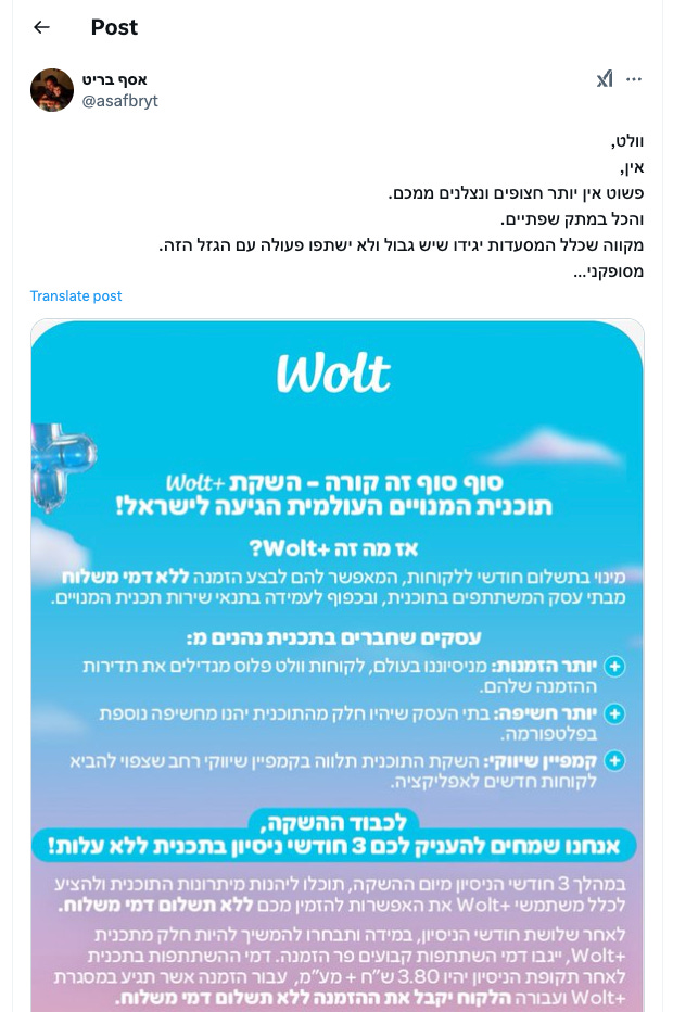 שנים נמנעתי מלעבוד עם וולט. הייתי פריבילג. לא הייתי צריך אותם. הייתה עבודה מאוד יפה תמיד. היינו ריווחים [...] בעיקר לא רציתי לשלם עמלה שנראתה לי גזל מטורף של מעל 30 אחוז. כי מה בדיוק נשאר לי מזה? ממש לא הרבה!